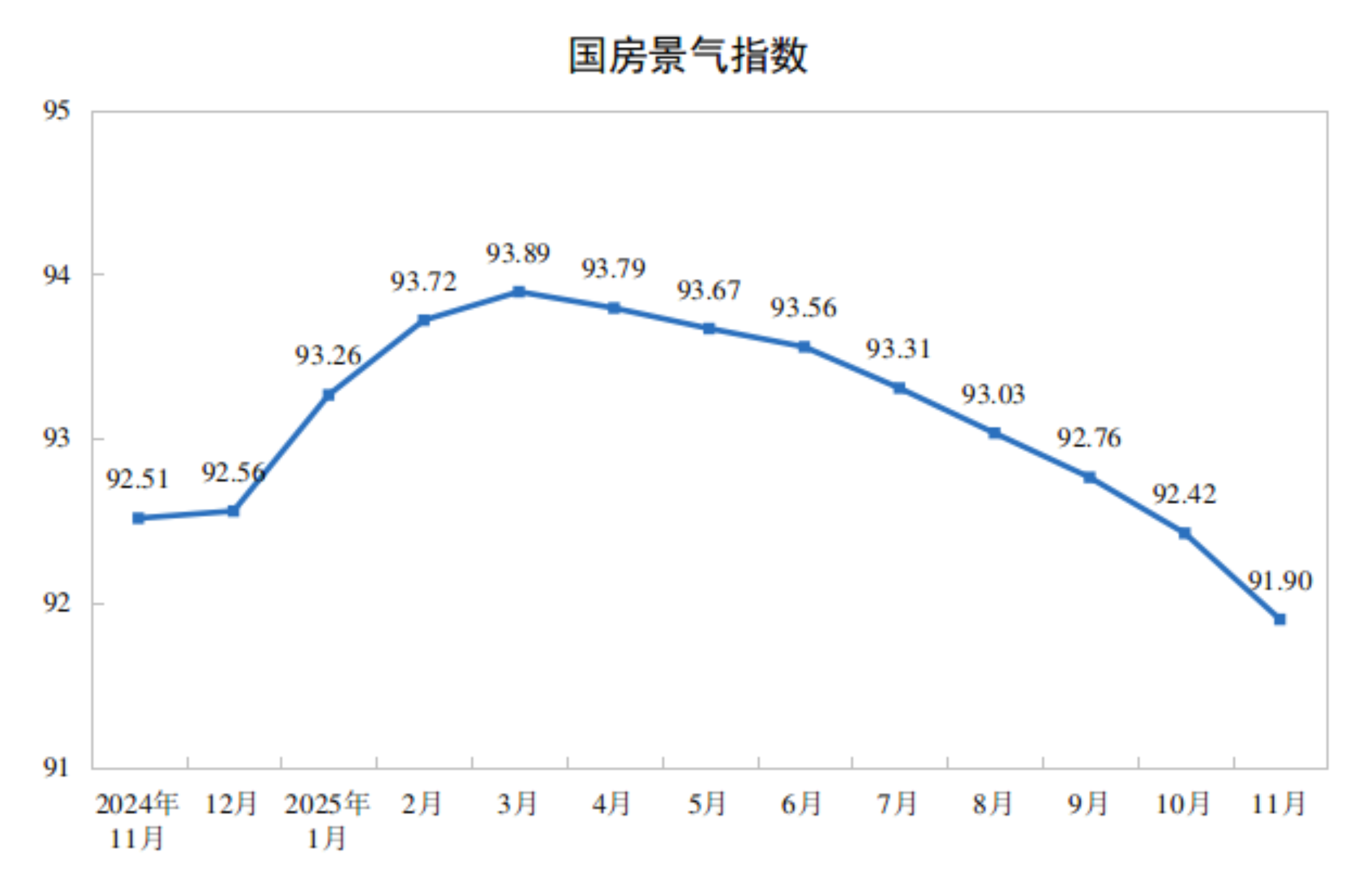 11月份,房地产开发景气指数(简称“国房景气指数”)为91.90。